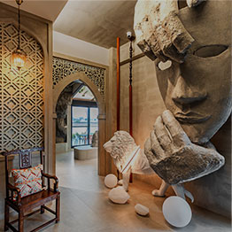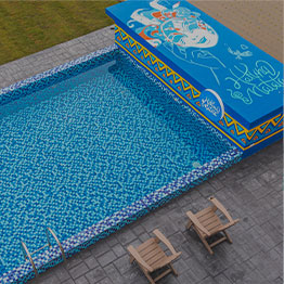 藍色馬賽克泳池與裝置藝術,白天戲水、夜晚浪漫。