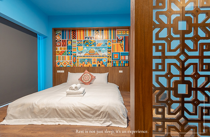 每一間房都融入非洲風格的元素:色彩鮮明的壁畫、手工陶盤、獨特的燈飾與細緻的空間氛圍,讓你在休憩時也能感受到異國的靈魂。
